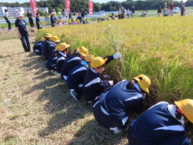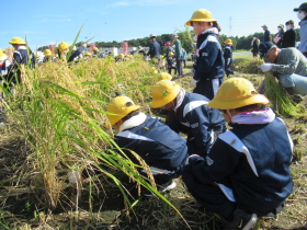 秋晴れの空の下で、稲刈り会を行いました。 |