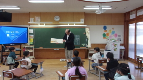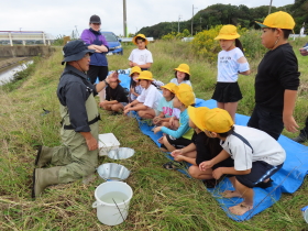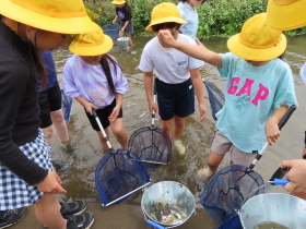 4年生が、歴史と未来の交流館から講師の先生をお迎えして新川で水生生物観察学習を行いました。  |